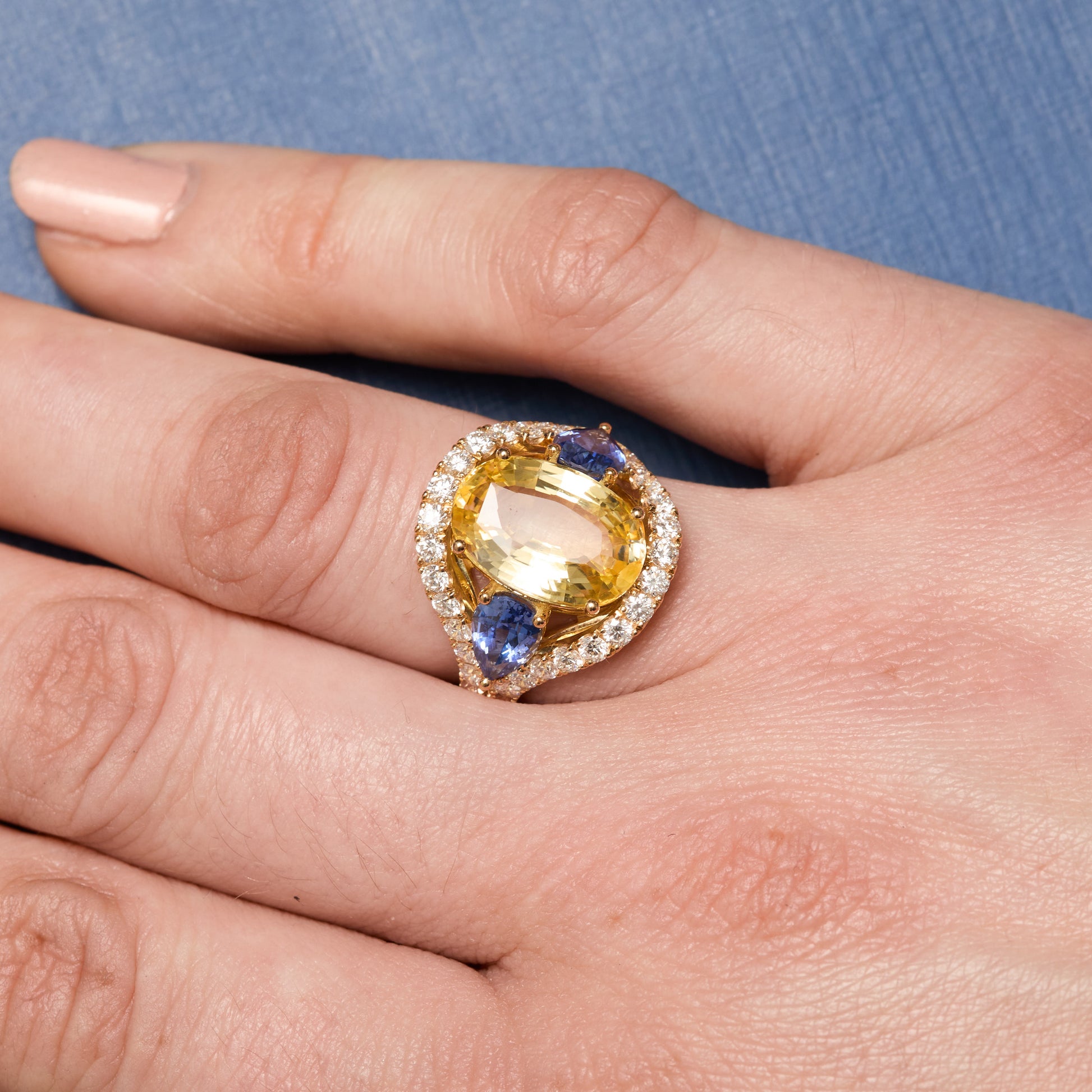 - Bague Bandeau en or jaune sertie d'un saphir jaune de 5.69 carats de forme ovale accompagné de 2 saphirs cornflower de forme poire (1.89 carats) et 34 diamants FVS de 2mm (1.02 carats)